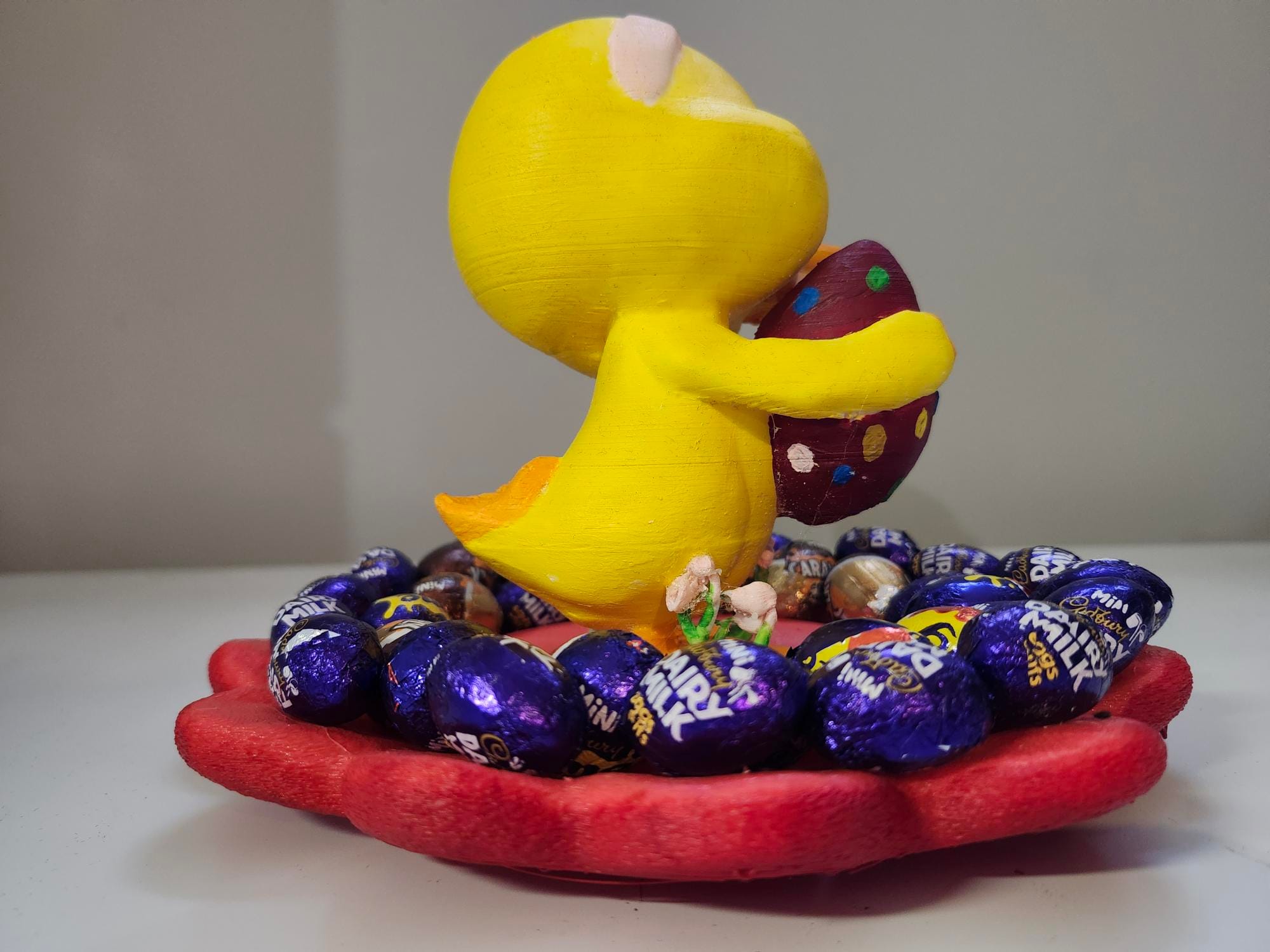 Easter Duck is a cute little duckling with a pretty pink ribbon and lots of delicious little Easter chocolates, sitting on a tray.