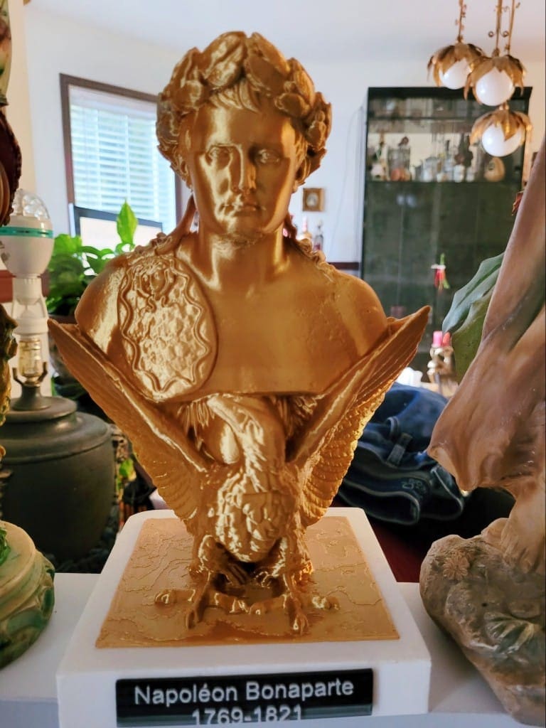 Napoleon Bonaparte statuette, a wonderful gold-shine colored statue made of solid plastic, mounted on an inscribed base.